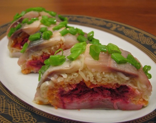 5. Свеклу натрите тоже, отожмите и смешайте с майонезом. Поместите свеклу в центре формы.