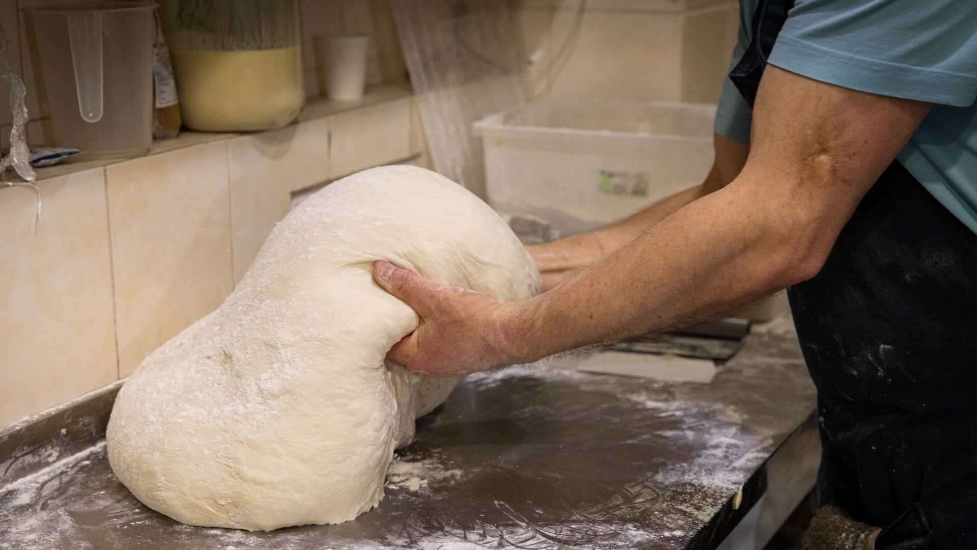Когда тесто станет сложно мешать, его следует переложить на присыпанный мукой стол и продолжать месить руками, но следить, чтобы оно не стало грубым.