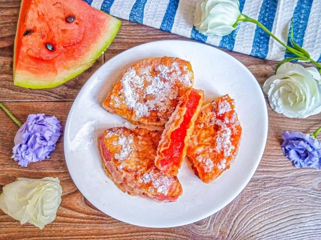 6. На хорошо разогретую сковороду с растительным маслом выкладываются ломтики арбуза в кляре. Обжаривайте их до золотистой корочки с обеих сторон по 2 минуты.