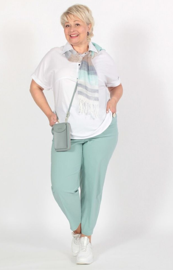 - Летний комплект: для женщин среднего возраста подойдут мятно-бирюзовые прямые брюки, достигающие щиколотки, и светлая свободная футболка. Легкий шарфик добавит образу изящности, а удобные кроссовки завершат аутфит.