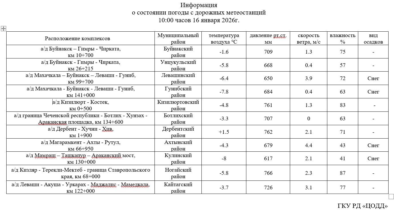 Информация о состоянии погоды с дорожных постов метеоконтроля на 16 января 2026 года
