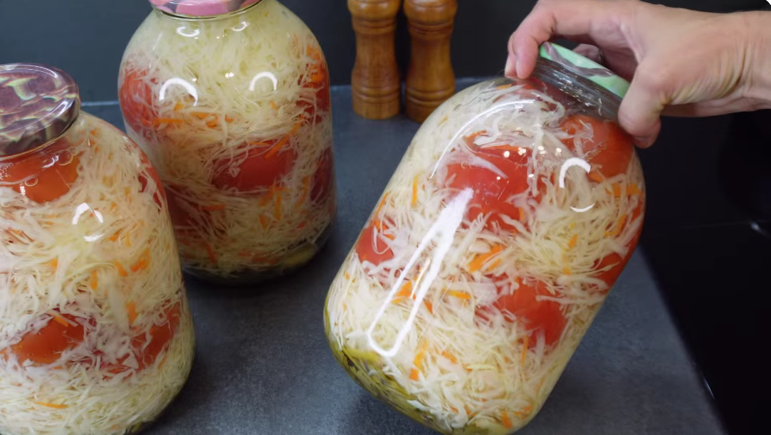 Следующий шаг — стерилизация банок. На дно каждой банки укладываются веточки зелени, горошины перца, чеснок и лавровый лист. Затем банки наполняются капустой и помидорами слоями.