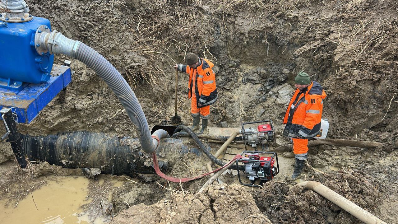 Аварийные бригады работают в непрерывном режиме, несмотря на размытый грунт, сложные подъездные условия и большую глубину залегания водопровода. В настоящее время ведется откачка значительного скопления воды, необходимого для обеспечения доступа к месту утечки.