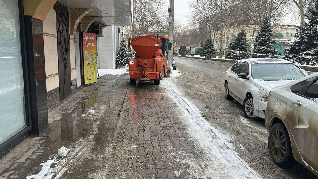 Продолжается активная работа по расчистке проезжей части и тротуаров от снега и гололеда.
