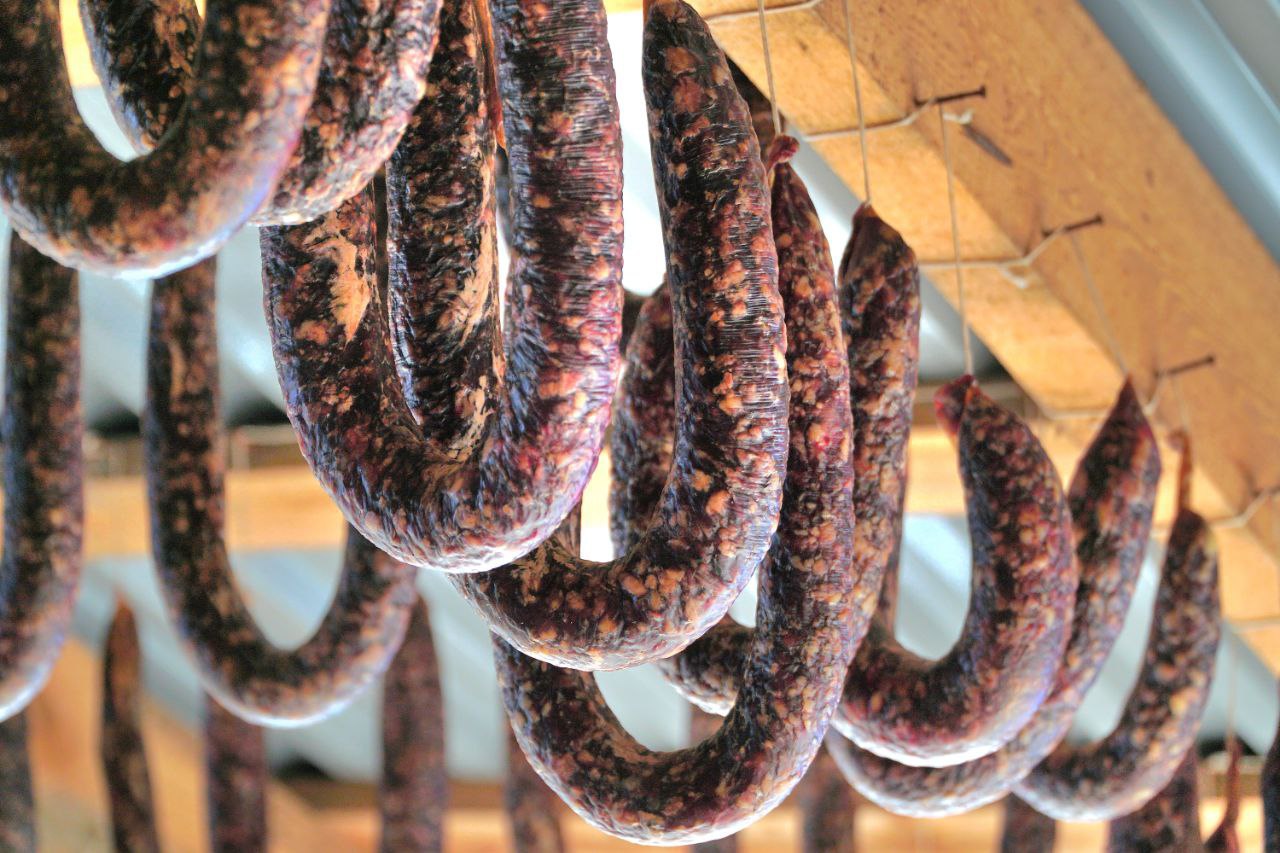 Главный секрет — метод естественной сушки на открытом воздухе, который длится более двух недель. Низкие температуры и свободная циркуляция воздуха обеспечивают правильную ферментацию, насыщенный вкус и долгий срок хранения без консервантов.
