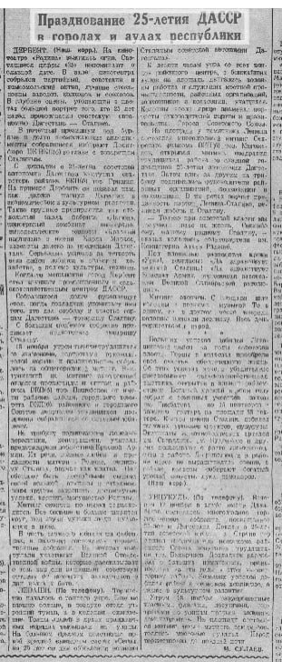 В ноябре 1945 года, вскоре после окончания войны, в Дагестане отмечали 25-летие образования автономной республики. Праздничные события проходили по всем городам и районам.