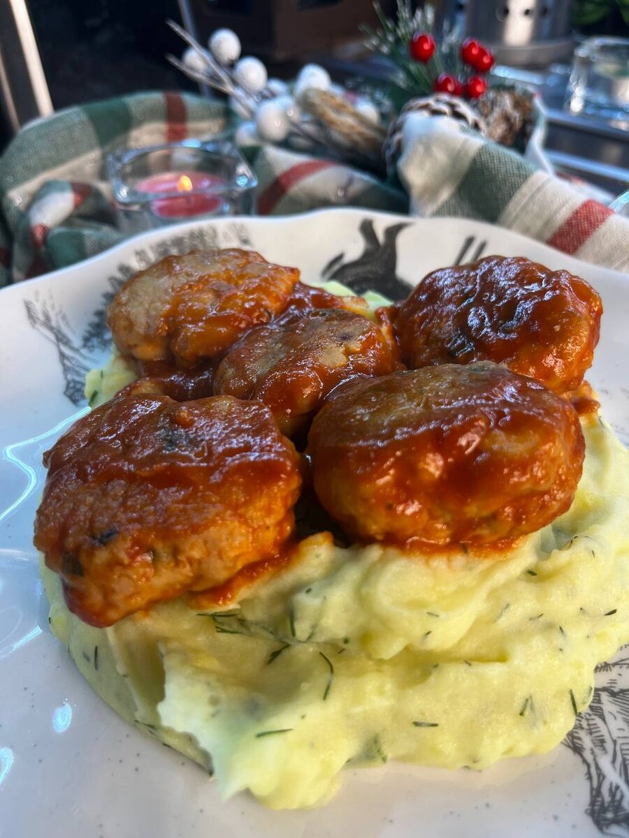 Тефтели подаются с пюре и щедро поливаются соусом — это настоящая кулинарная магия на вашем столе.