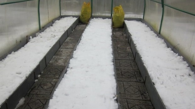 По вычислениям, на квадратный метр грядки требуется 3-4 ведра снега для слоя 40 см. Таким образом, на теплицу размером 3 на 8 метров нужно около 80-90 ведер за всю зиму.