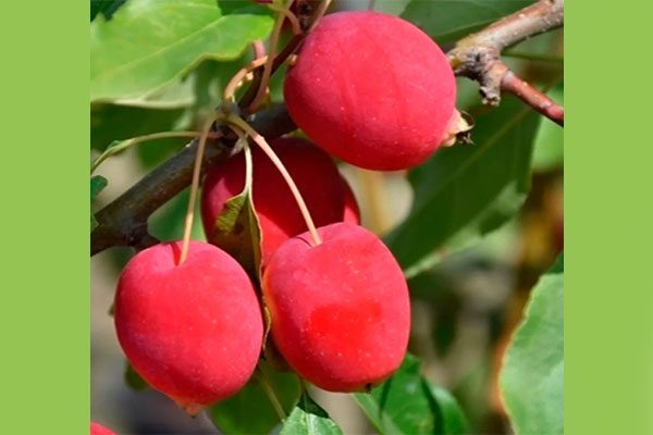 Китайка Долго достигает высоты до 4 метров и формирует широкую крону, что создает кустарниковый эффект. Мелкие плоды массой 11-16 г имеют яйцевидную форму, окрашены в насыщенный красный цвет с желтым фоном и покрыты сизым налетом. Яркая мякоть, обладающая фруктовым ароматом, делает их отличными для приготовления компотов и десертов.