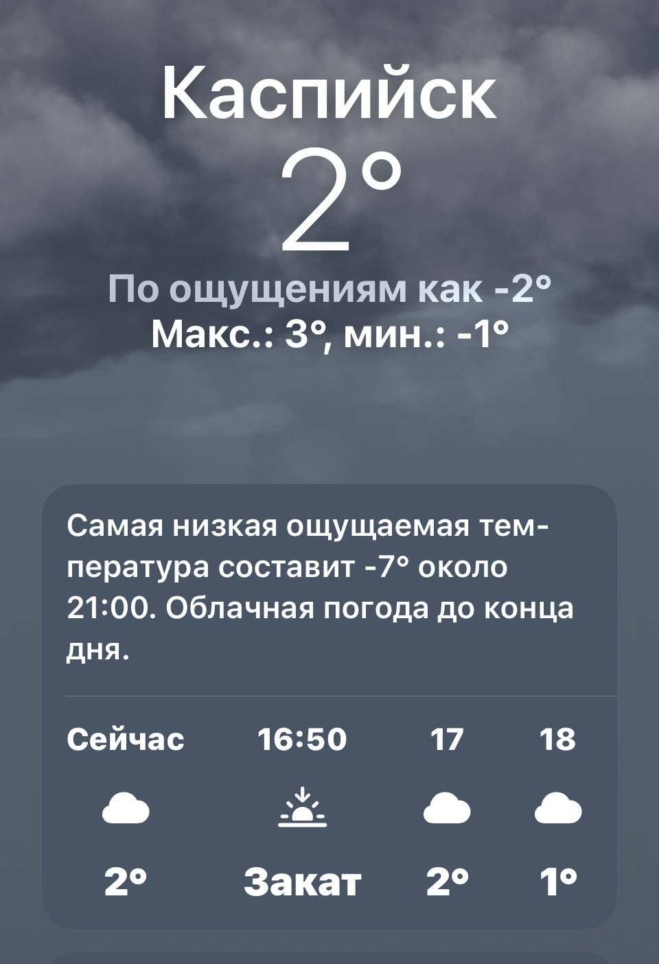 В Каспийске ожидается облачная погода преимущественно без осадков, температура воздуха днем +1..+3 оС ночью -1...-2 оС, порывы ветра до 6 м/с