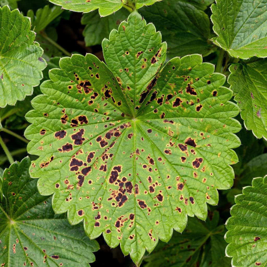 Пятна чаще всего возникают из-за грибковых заболеваний. Белая пятнистость склонна образовывать мелкие красно-коричневые точки с последующим обнажением ткани, а бурое очертание часто сопровождает листья с темными точечками на поверхности. Разные патогены активнее при влажной погоде и загущённых посадках, поэтому проветривание и расстояние между кустами важны не меньше обработки.