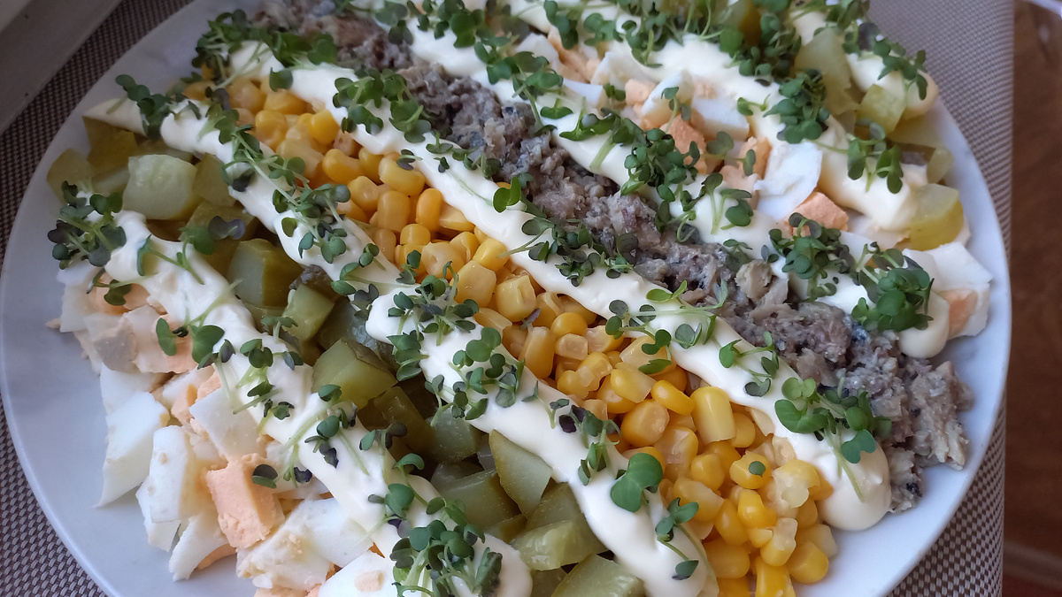 Как это выглядит на практике: начните с расправления слоя из кукурузы на тарелке как основы. Рядом — полосы маринованных огурцов, они задают цвет и структуру. В центре разместите варёные яйца и мелко нарезанную рыбу, а сверху аккуратно распределите майонез и зелень.