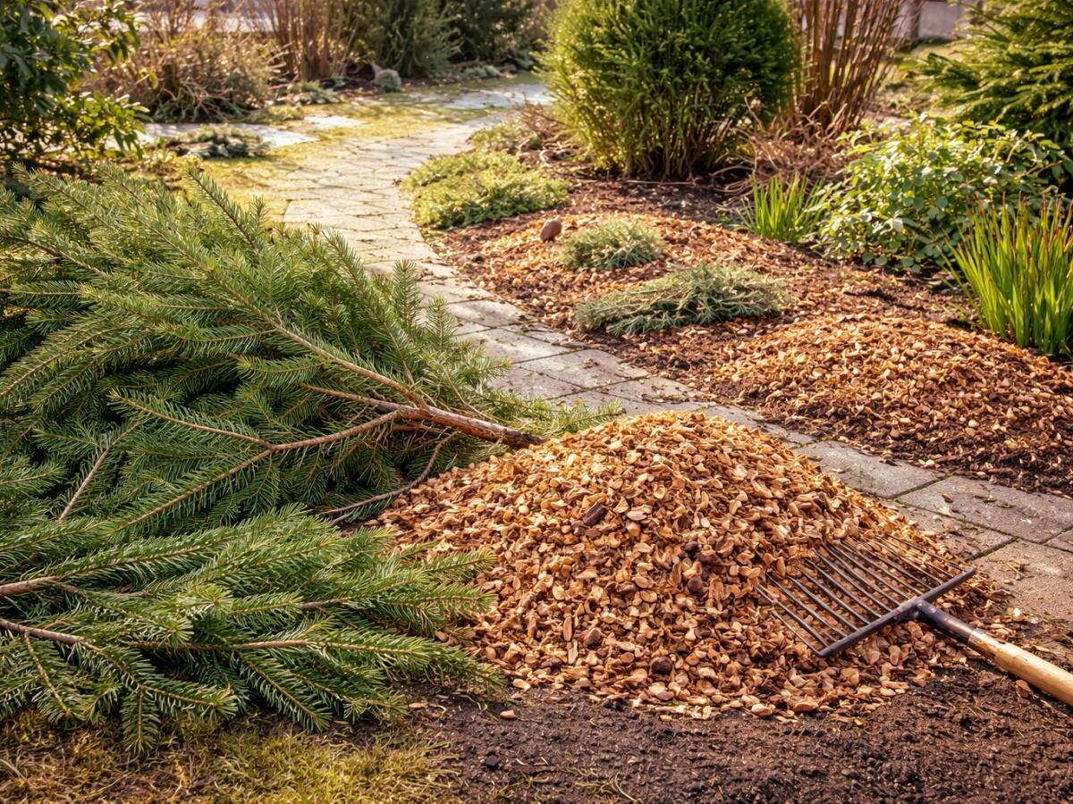 Если компост кажется рискованным или долгим, есть более практичные решения. Измельчённая ёлка становится отличной мульчей, которая сохраняет влагу, защищает почву от перепадов температуры и подавляет сорняки вокруг клумб и хвойников. В городах иногда работают площадки по сбору ёлок: из древесной щепы и переработанного материала получают готовый компост для благоустройства территории.