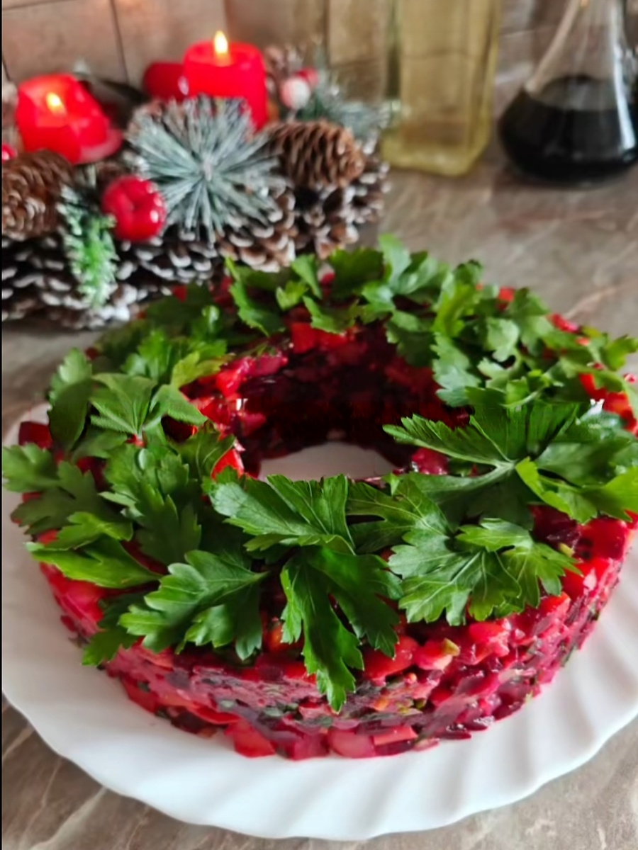 Рождественский венок из винегрета с опятами: простой и эффектный салат на стол