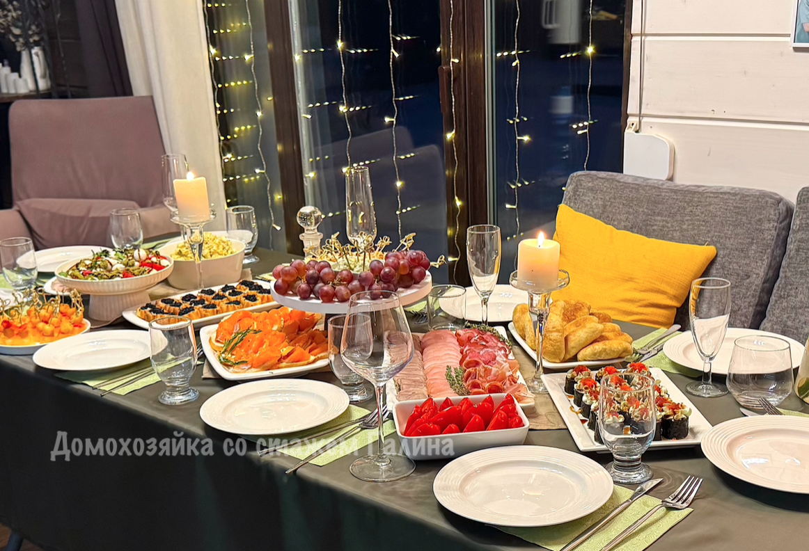 На таком столе удачно соседствуют блюда из разных культур, не заменяя традиции, а дополняя их. Салат капрезе задаёт легкость и яркость, роллы с горбушей неожиданное разнообразие, а закуски на шпажках добавляют игривость. Важен каждый выбор, потому что он говорит о вкусе и внимании к гостям.