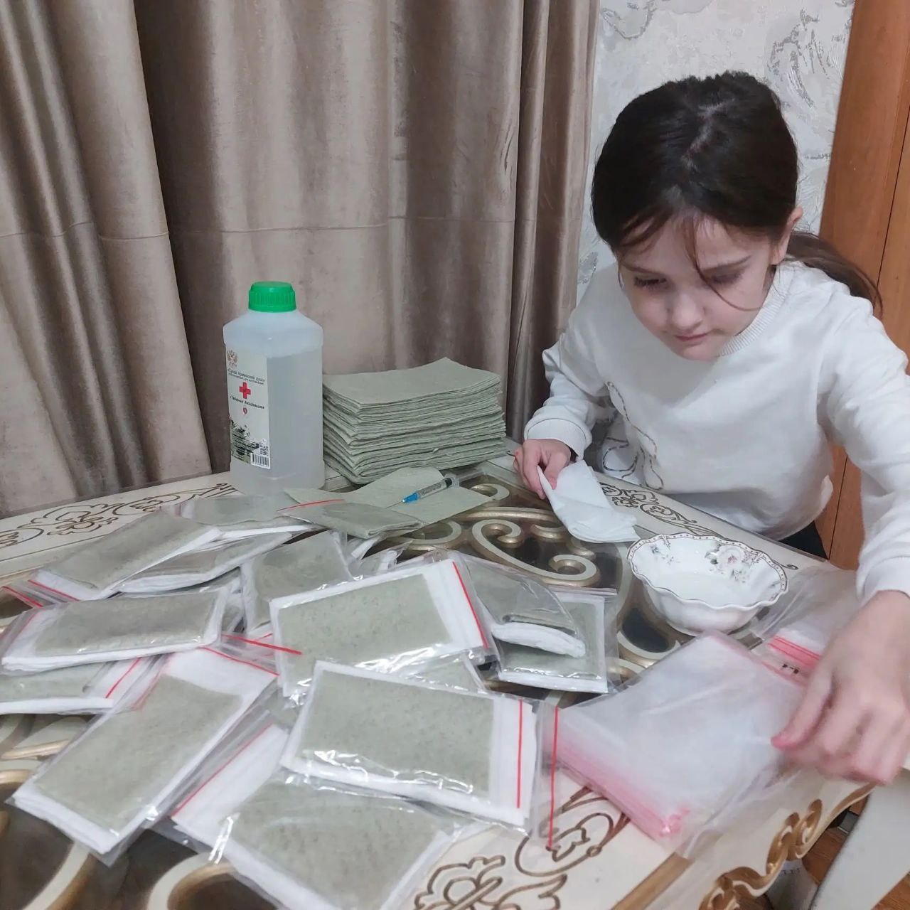 Воспитанница МБО ДО «ЦДТТ г. Каспийска» Чамсулвараева Арина Магомедовна в свободное от учёбы время изготавливает наборы «сухого душа» для участников специальной военной операции.