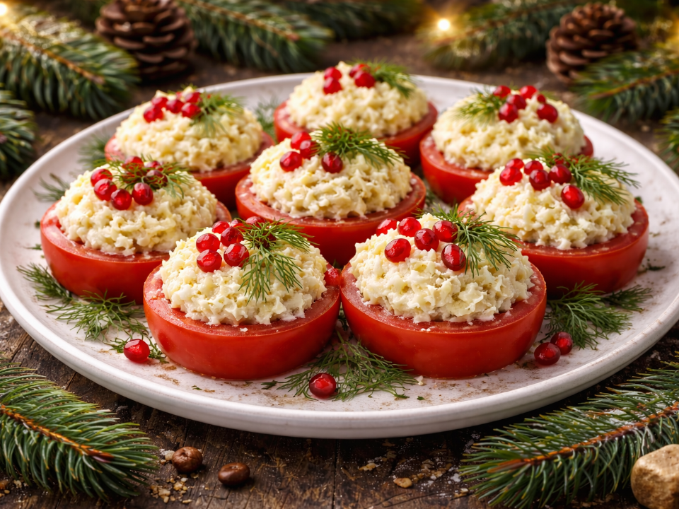 На каждый кружочек помидора с помощью чайной ложки или кондитерского мешка выложите начинку. Вы можете разровнять ее для гладкой поверхности или оставить фактурной. Для придания праздничности добавьте сверху немного гранатовых зерен или веточку петрушки. Подавайте закуску сразу, чтобы насладиться хрустящей текстурой помидоров.