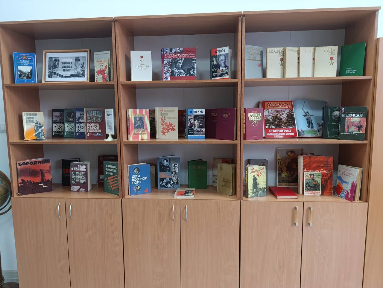 Экспозиция объединила книги и материалы, рассказывающие о героических событиях Сталинградской битвы, мужестве советских солдат и стойкости мирных жителей.