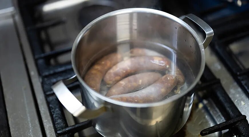 Предварительная варка помогает сохранить влагу внутри, а оболочка становится более эластичной. Это значит, что во время жарки начавшееся расширение мясной массы не приведет к разрыву. Бонус: если во время варки добавить специи, купаты приобретут необычайный аромат и вкус.