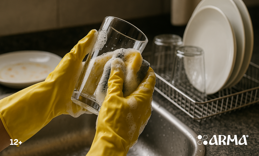 - Моющее средство. Рекомендуется использовать средства специально для ручного мытья, которые эффективно справляются с жиром и безопасны для кожи. Бренд «Арма» предлагает замечательные варианты для заботящихся о здоровье.