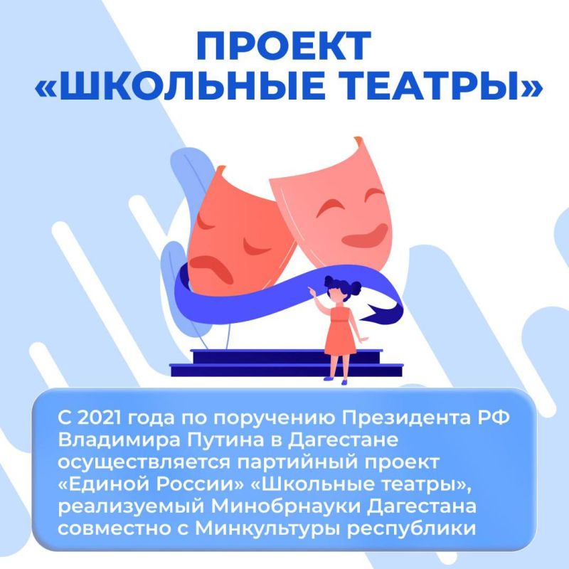 По поручению Президента РФ Владимира Путина в республике развивается проект «Школьные театры», реализуемый Минобрнауки республики совместно с Минкультуры Дагестана.Создано 1370 школьных театров, подписано 50...