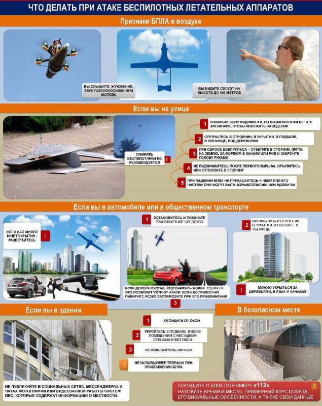 При обнаружении или атаке БПЛА рекомендуется:не паниковать, не приближаться к объекту;спуститься на нижние этажи здания, в подвал или паркинг, избегая лифтов;если вы на улице, немедленно укройтесь в ближайшем здании, подземном переходе;в...